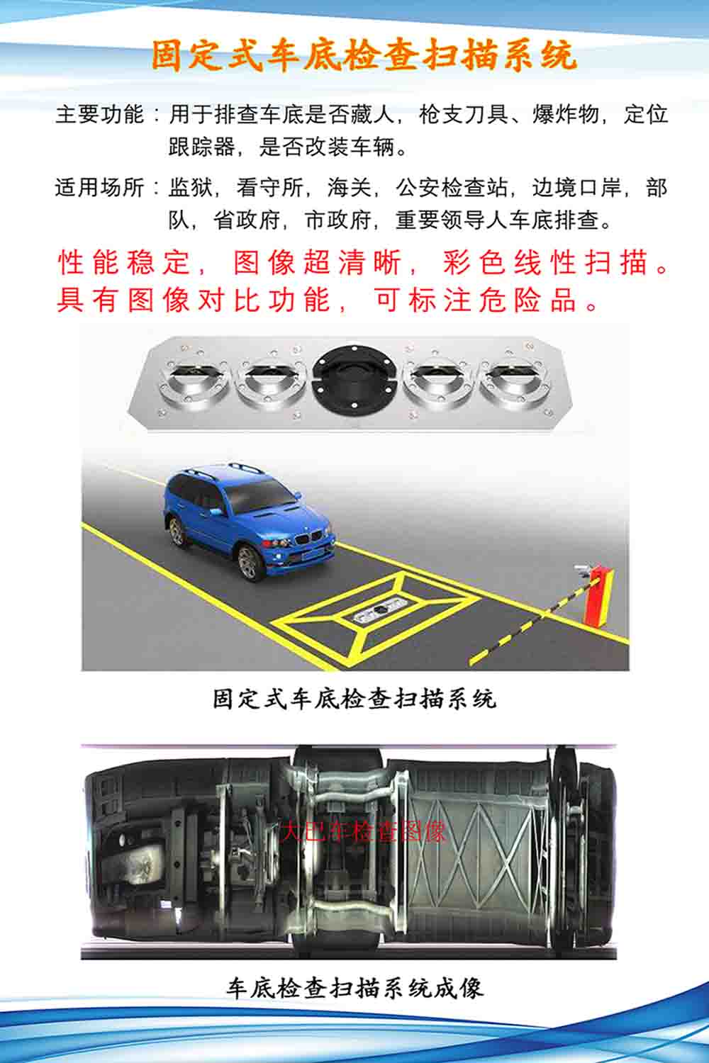11、车底图像自动拍摄:当车辆以1-50km/h的速度通过车底扫描仪时,车辆经过之后,系统在1S内显示该图像,当车辆在车底扫描仪 图像采集区域内静止一定时间后再继续通过车底扫描仪后,车底图像显示完整。